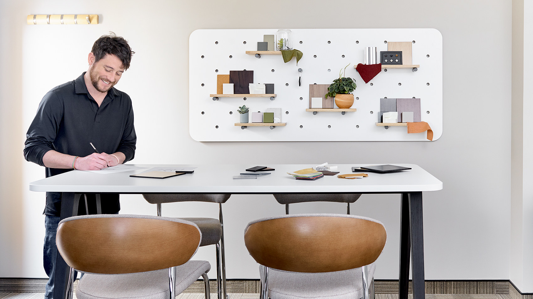 OFS modern conference area with bulletin board and lounge chairs