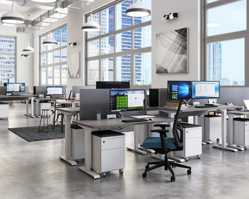 ELEMENT office furniture open office area with height adjustable desks in light and dark grey